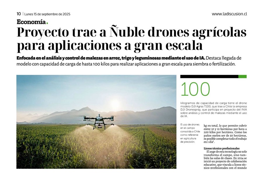Diario La Discusión de Chillán publicó reportaje de proyecto que protege cultivos de arroz, trigo y leguminosas que reúne a INIA, FIA, la Subsecretaria de Agricultura, el Centro Nacional de Inteligencia Artificial (CENIA), los SAT de agricultores del Maule-Ñuble y empresas de drones (leer artículo).
